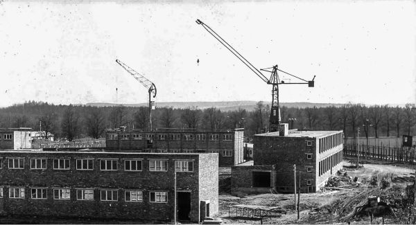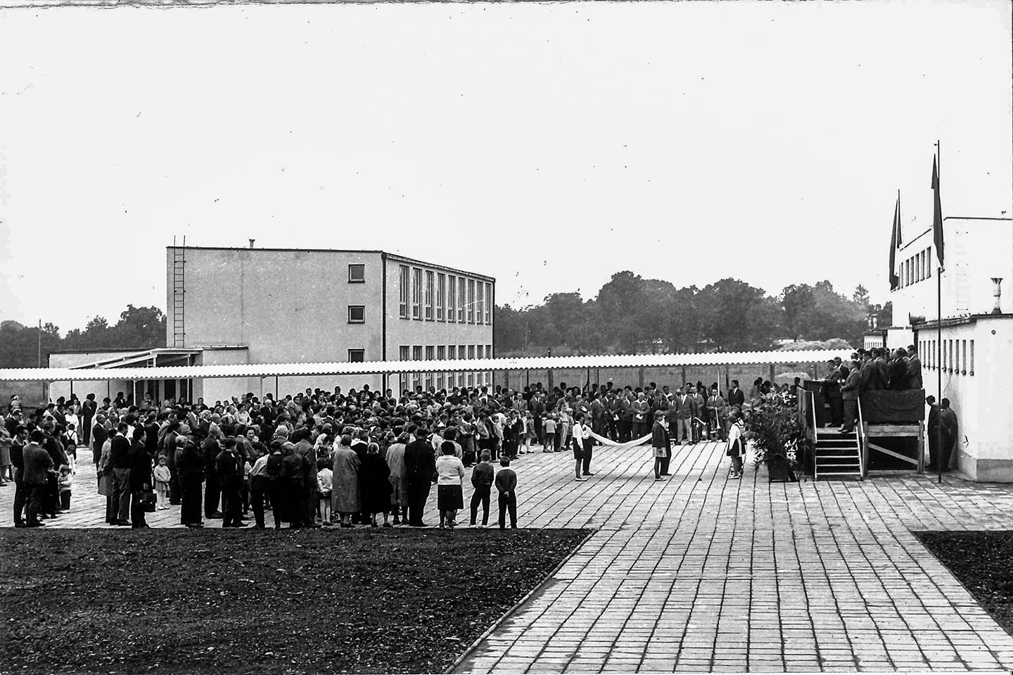 O výstavbě další školy se nesměle hovořilo již od počátku 50. let 20. století a na začátku další dekády už bylo zřejmé, že s výrazným nárůstem počtu obyvatel Dobříše roste i počet školou povinných dětí. Přikročilo se tedy po mnoha jednáních k rozhodnutí postavit na volných pozemcích za stávající školou, která už kapacitně přestávala stačit, školu novou. Projektovou dokumentaci vypracoval ing. Náhlík z Krajského projekčního ústavu v Praze a mělo se jednat o pavilonový komplex skládající se ze sedmi pavilonů. Se stavbou začaly Stavební závody Jáchymovských dolů v červnu 1963 a již za dva roky byla stavba dokončena s celkovými náklady 7 milionů Kč. Slavnostní otevření areálu, který nesl oficiální název „Školy dvacátého výročí osvobození v Dobříši“, se odehrálo v neděli 29. srpna 1965. Kromě vedení města a kraje dorazil i náměstek ministerstva školství soudruh Jiří Hendrych a poslankyně Národního shromáždění za Středočeský kraj paní Zdena Kenclová, která se kupodivu dostala k této funkci, i když byla bezpartijní. Na slavnostním pódiu kromě náměstka Hendrycha pronesli projev i tajemník Milan Černý a předseda místního MNV Karel Hrbek. Kromě „Základní devítileté školy“ se otvírala i „Střední všeobecně vzdělávací škola“, což bylo vlastně gymnázium. V průběhu následujících šesti dekád prošel komplex několika stavebními úpravami a modernizacemi, takže s podobou areálu z roku 1965 už nemá mnoho společného, ale ty původní pavilony pořád stojí na svých místech.