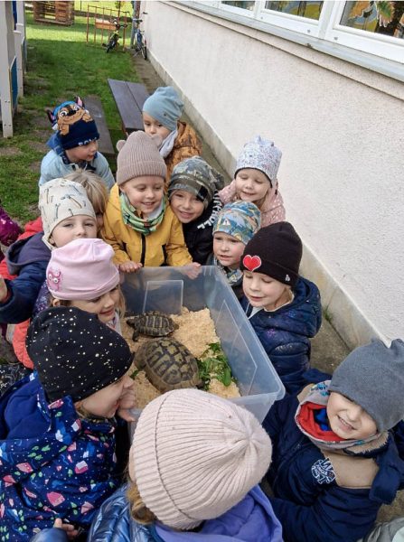 Na začátku měsíce jsme u nás přivítali program Želvičky v MŠ. Děti se dozvěděly o životě těchto pomalých, ale moudrých tvorů, zblízka si prohlédly dvě velké starší želvy a zjistily, jak se o ně starat. Součástí akce bylo i zabydlení dvou malých želviček v teráriu naší školy. Od tohoto dne se děti o naše nové kamarádky starají a v péči se střídají po jednotlivých třídách.