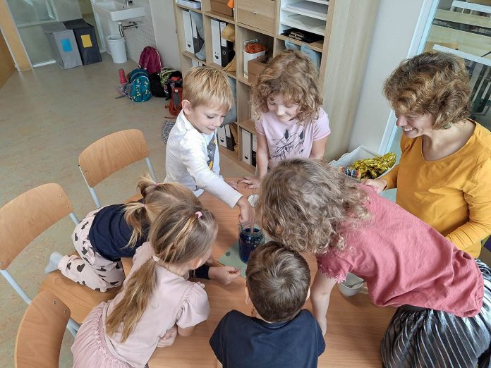 Už to není jen školka, kde si děti hrají, ale poznáváme svět a sami sebe, svoje emoce, učíme se s nimi pracovat a rozumět tomu, že jsme každý jiný, ale že to nevadí, že si navzájem můžeme hodně předat. Abychom byli připravení na první třídu, trénujeme samozřejmě také grafomotoriku, píšeme, kreslíme, obtahujeme. Chodíme do přírody a vyrábíme z ní krásné věci. Zpíváme a tancujeme. Každý týden se účastníme celoškolního kruhu, kde se potkáváme i se staršími dětmi a učíme se nimi komunikovat a nemít z nich strach. Všichni dohromady si také hrajeme v odpoledním klubu a chodíme na kroužky tvoření nebo ateliéru hudby a pohybu. Od ledna nám začne i angličtina pro nejmenší. Hlavně se ale učíme samostatnosti a odpovědnosti za svoje chování a svůj život, tak jak nám to věk dovolí. Děláme chemické pokusy, chodíme do lesa a učíme se relaxační techniky, aby nám bylo ještě líp.
