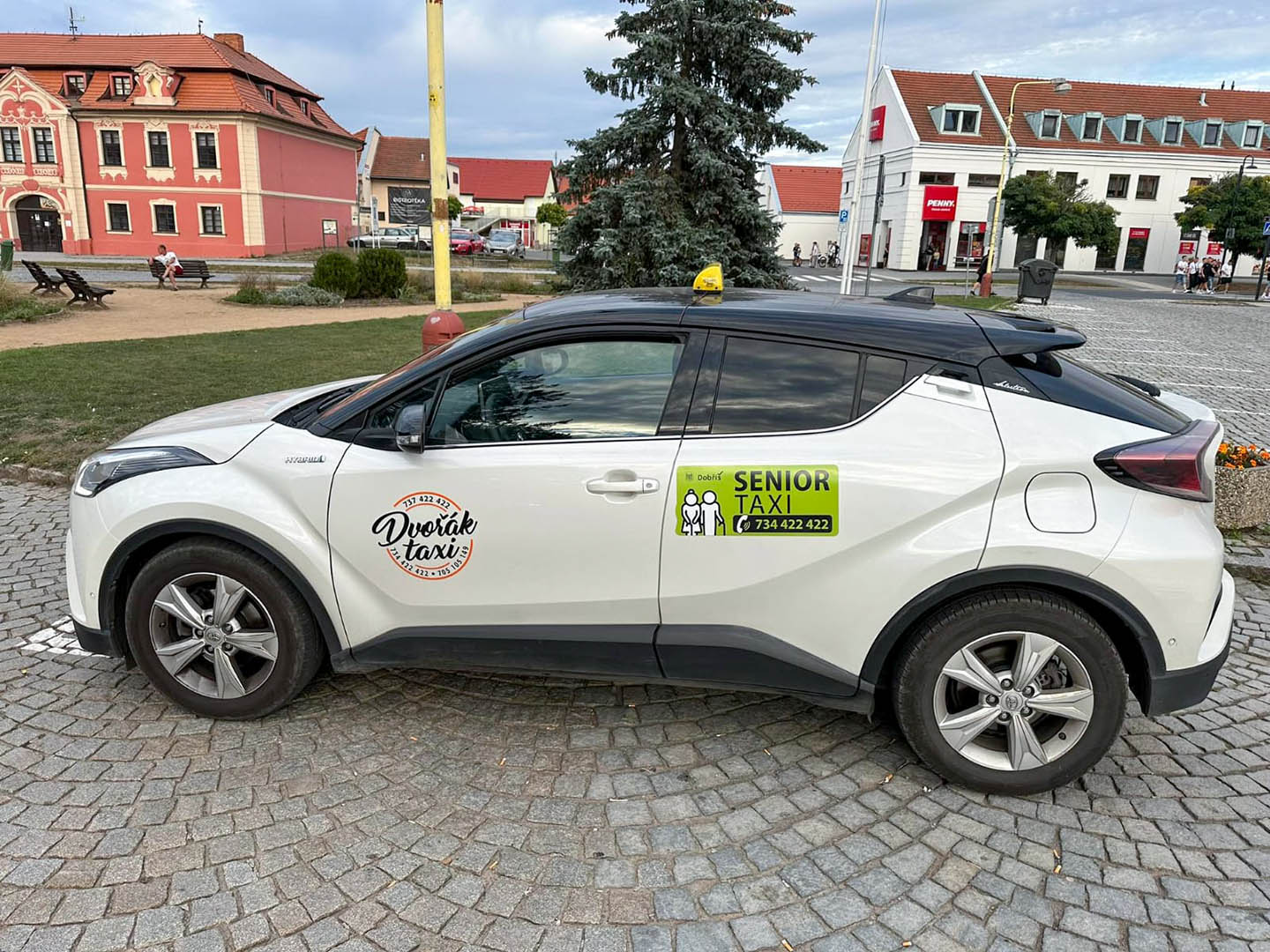 - vozidlo je černobílé, označeno štítkem „SENIOR TAXI“ a „Dvořák taxi“.