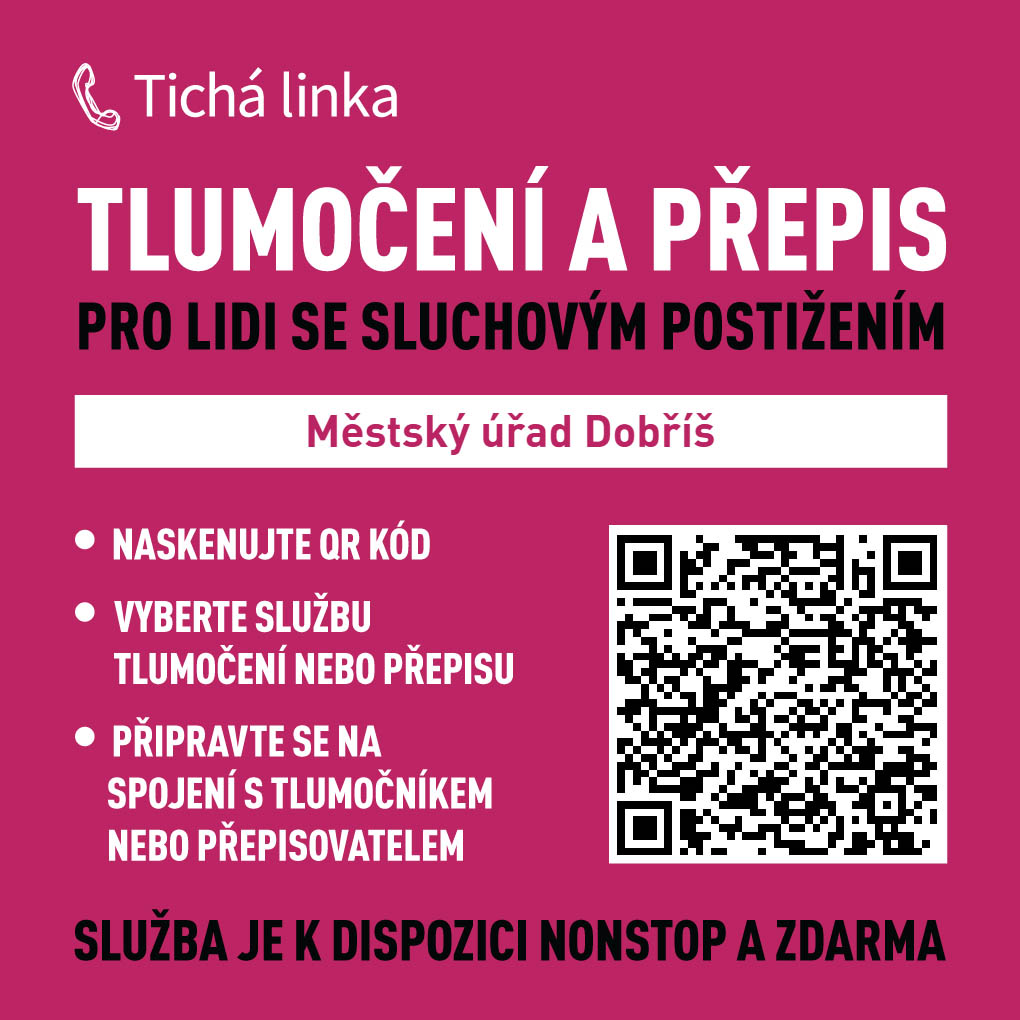 Městský úřad Dobříš nově nabízí službu Tichá linka, která zajišťuje zdarma tlumočení pro neslyšící a přepis mluvené řeči pro nedoslýchavé. Stačí si naskenovat QR kód umístěný u vchodů a v kancelářích úřadu – během okamžiku se spojíte s tlumočnicí, která zprostředkuje komunikaci mezi klientem a úředníkem. Klient tlumočnici znakuje, ta jeho sdělení předává úředníkovi a naopak tlumočí, co říká úředník. Služba je dostupná zdarma a funguje nonstop. Díky Tiché lince je komunikace na našem úřadě otevřenější, jednodušší a přístupná opravdu všem.