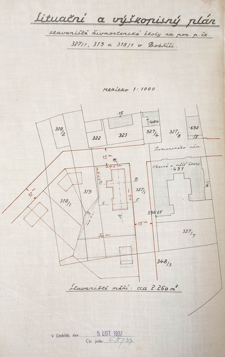 Ještě delší vývoj mělo budování živnostenské střední školy v Dobříši. Iniciativa vzešla ze strany Obchodního grémia v Dobříši v prosinci 1936. Bylo poukázáno na plán města Příbrami vybudovat novou budovu střední průmyslové školy, čímž by byl okres dobříšský k této škole „přiškolen“ a zanikla by živnostenská pokračovací škola v Dobříši. Této situaci se tedy mělo čelit vybudováním vlastní střední školy živnostenské. Již v listopadu 1937 vznikl projekt na vybudování živnostenské školy na pozemcích čísel 327/1, 319 a 318/1, tedy vedle měšťanské školy v místech dnešní mateřské školy. Z ministerstva školství a národní osvěty však záhy přišla reakce, že projekt je příliš předimenzovaný, a bylo doporučeno přepracování. Po okupaci země sice město stále usilovalo o vybudování střední školy, ale z ministerstva stále přicházely námitky a odklady. Celkem se ve škole počítalo se čtyřmi učebnami, s dílnami pro krejčovství, pro rukavičkáře, pro holiče, pro kovodělníky, elektrotechniky, automechaniky a truhláře. I přes velice důkladný projekt architekta Vladimíra Šebesty se stavba nakonec nerealizovala.