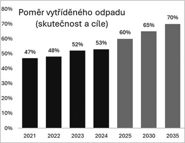 Zákon o odpadech ukládá všem obcím pro letošní rok pevný cíl. V roce 2025 musí obce třídit 60 % z produkovaných komunálních odpadů, v roce 2030 to již bude 65 % a v roce 2035 dokonce 70 %. Nyní máme k dispozici data za celý rok 2024. V Dobříši bylo v loňském roce svezeno 1 358 tun směsného komunálního odpadu (SKO), tříděný komunální odpad (TKO) pak představoval celkem 1 504 tun. Z celkového množství odpadu tak tříděné složky tvořily 52,55 %. Ke splnění cíle „60 procent“ nám v roce 2024 chybělo přesně 7,45 %.