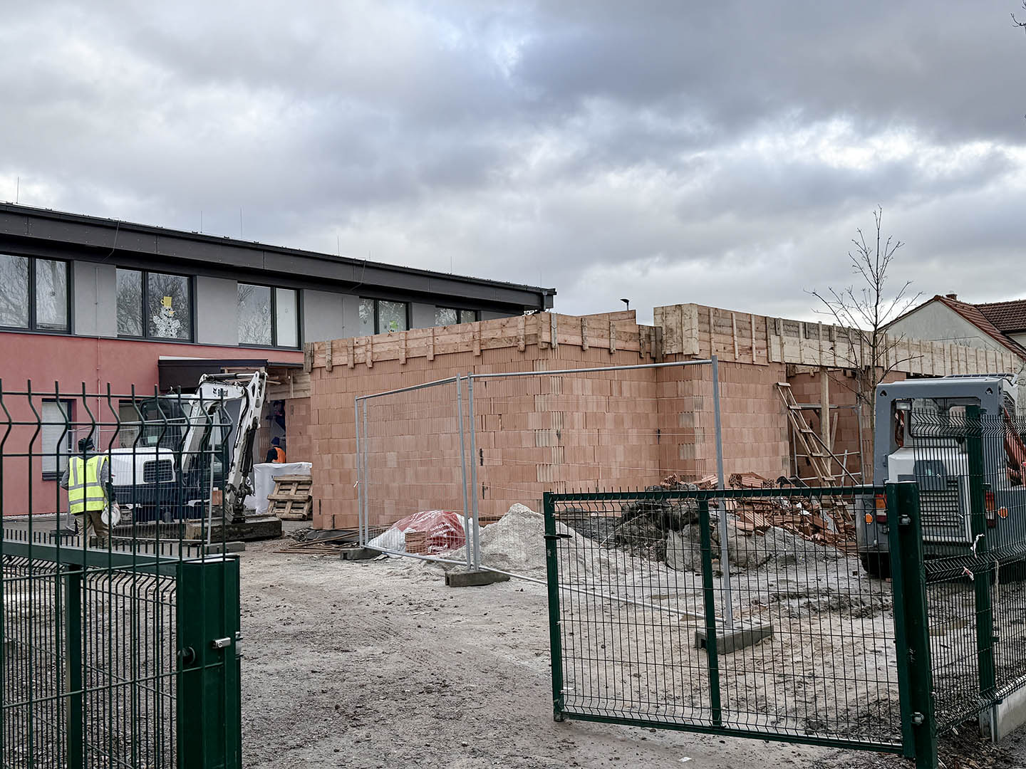 Přístavbu jídelny provázela řada specifických výzev: úprava vstupu do areálu, přesazování stromů, přeložky sítí a další práce. Nedílnou součástí projektu byla také úprava části parku jako náhrada za zastavěnou část školkové zahrady. S touto změnou souviselo přemístění altánu. Podařilo se jej naložit, převézt a znovu usadit bez nutnosti demontáže, a to díky všem zúčastněným – především bravurní práci paní jeřábnice a citlivé jízdě řidiče s tímto neobvyklým nákladem.
