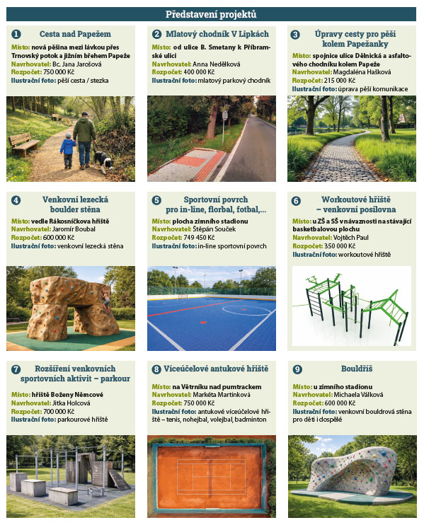 Představujeme vám nyní všechny podané projekty do letošního ročníku a dovolujeme si upozornit na fakt, že v době uzávěrky Dobříšských listů a jejich zpracování, nebyly a nemohly být všechny návrhy dostatečně posouzeny, veřejně představeny a odsouhlaseny. Některé z níže uvedených projektů se proto nakonec nemusí objevit v samotném veřejném hlasování.